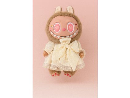 Roztomilá sběratelská postavička Labubu v krémových šatech s mašlí – kombinace jemnosti a hravosti, která potěší každého fanouška těchto unikátních plyšáků.