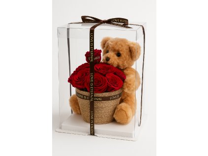 ❤️ Luxusní dárkové balení LOVE IS ETERNAL Elegantní kombinace hebkého plyšového medvídka a nádherných červených růží v dárkové krabici s mašlí. Jemné teplé světélka...