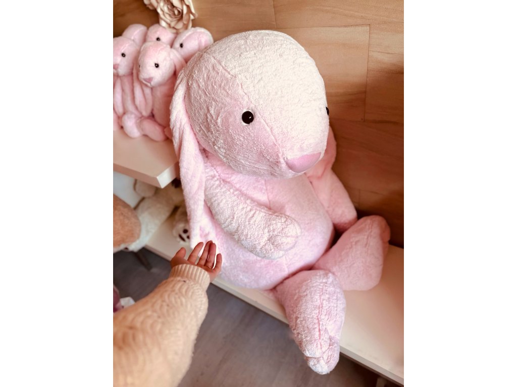 I když v této velikosti už Vám zabere v posteli mnoho místa, vypadá fantasticky a umí dělat radost i kdekoli jinde. Tlapky a zadeček má vycpaný microkuličkami, aby hezky seděl a na dotek je sametově heboučký. Má dlouhé velké uši a roztomilý růžový čumáček.