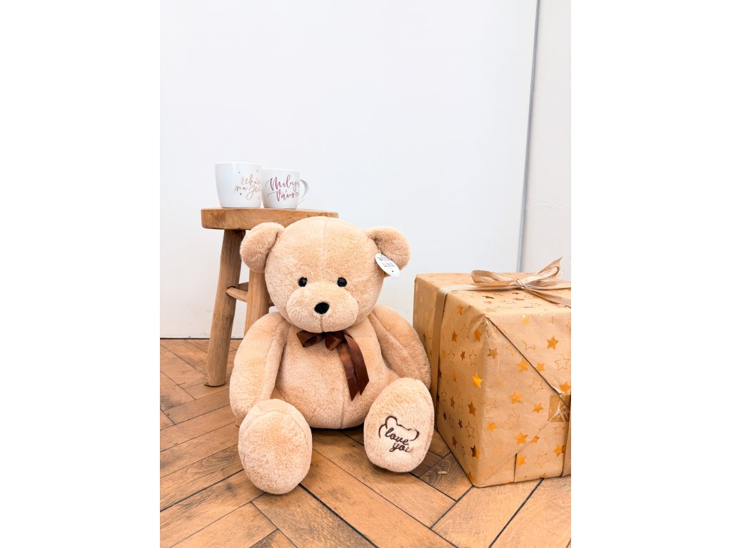 Tento heboučký plyšový produkt má rysy typického sedícího medvídka s výšivkou na plavkách Love You, na krku má hnědou mašličku a je připraven dělat radost.
